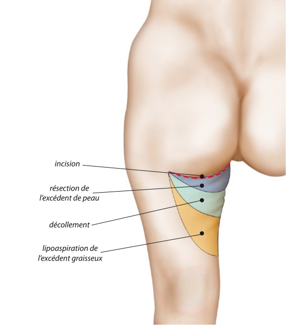 La peau en excès est retirée à la demande et une fixation est réalisée en profondeur au ligament aponévrotique, situé en haut de la face interne de la cuisse, de manière à bien maintenir la correction de l’affaissement, éviter que la cicatrice ne redescende et assurer la pérennité d’une anatomie normale et harmonieuse. La cicatrice se trouve ainsi cachée dans un pli naturel et sera donc assez discrète.